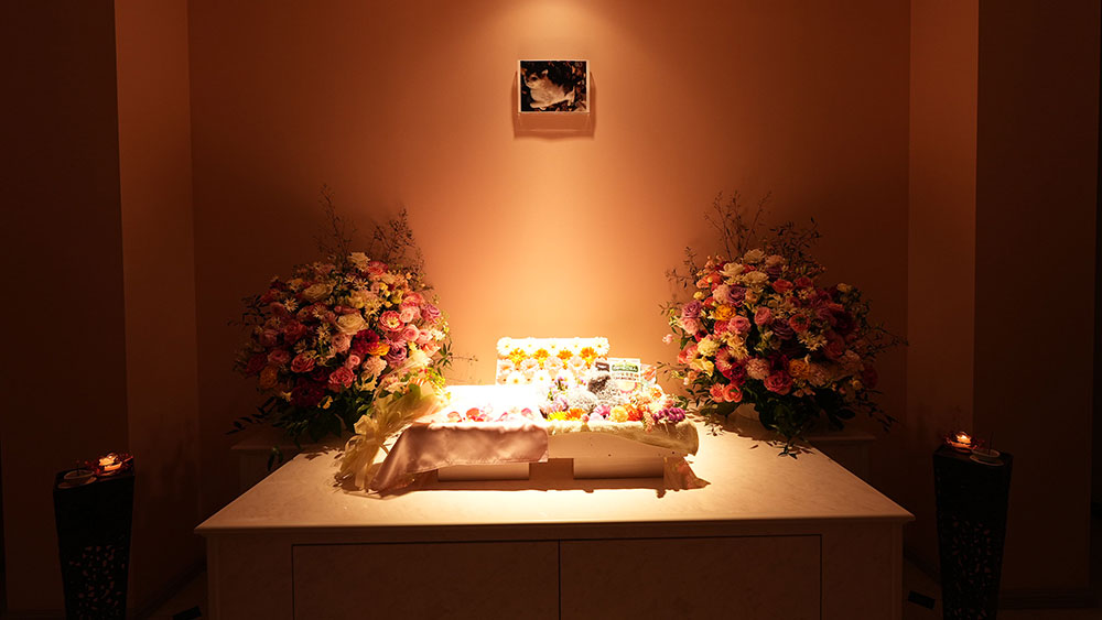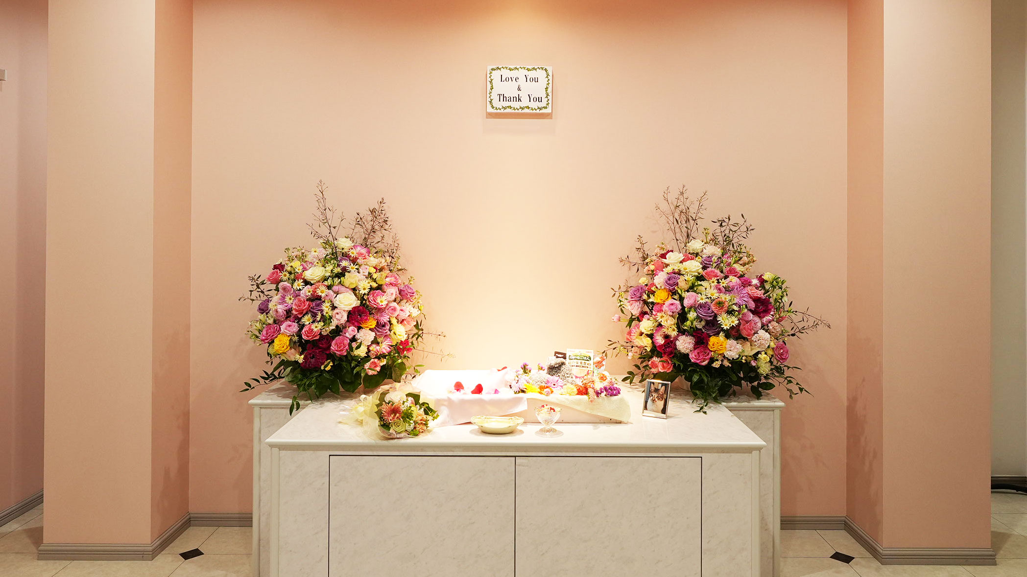 45分間のお別れの時間を持って頂けるプラン。生花で飾った祭壇、棺内をたくさんの花で満たして頂き、キャンドルの優しい光で包まれたホールで、静かにお過ごし頂けます。