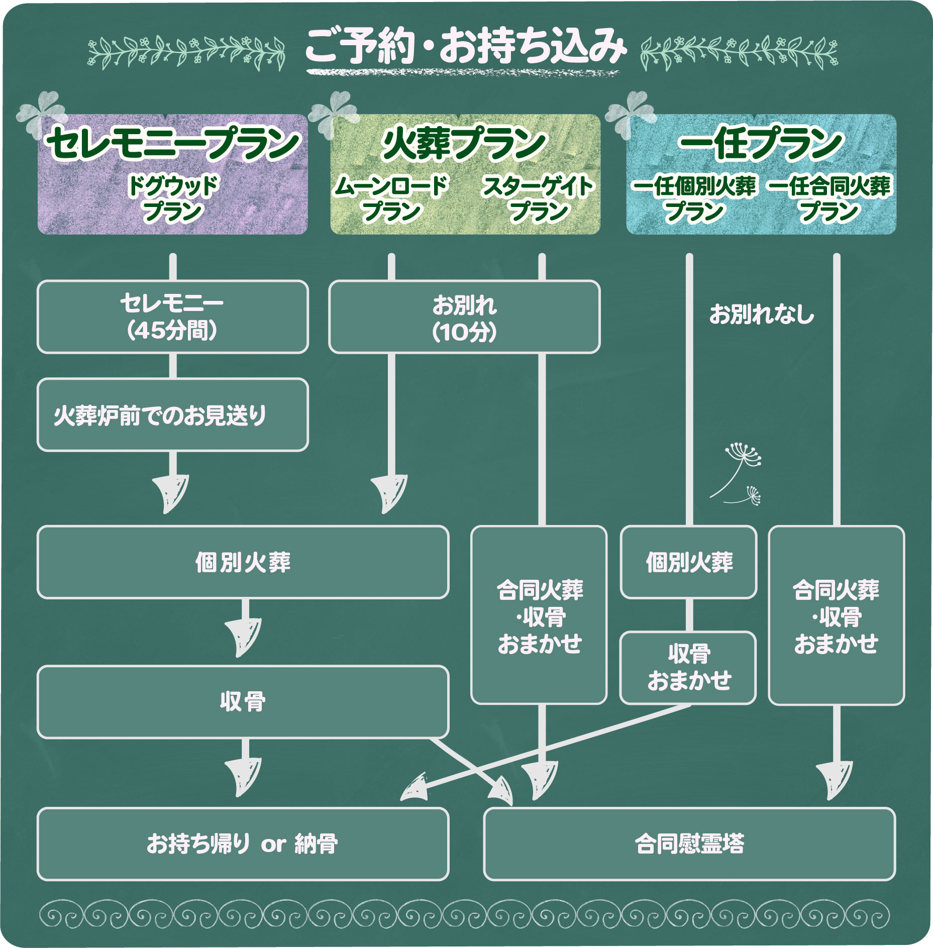 当クラブでは、6つのプランをご用意しております。お別れの時間を持って頂ける「セレモニー付き」のプランや、火葬の仕方や収骨の仕方まで色々とお選び頂けるまで、お客様のニーズに合わせたプランをご用意しております。ご都合に合わせてお見送りプランをお選び下さい。