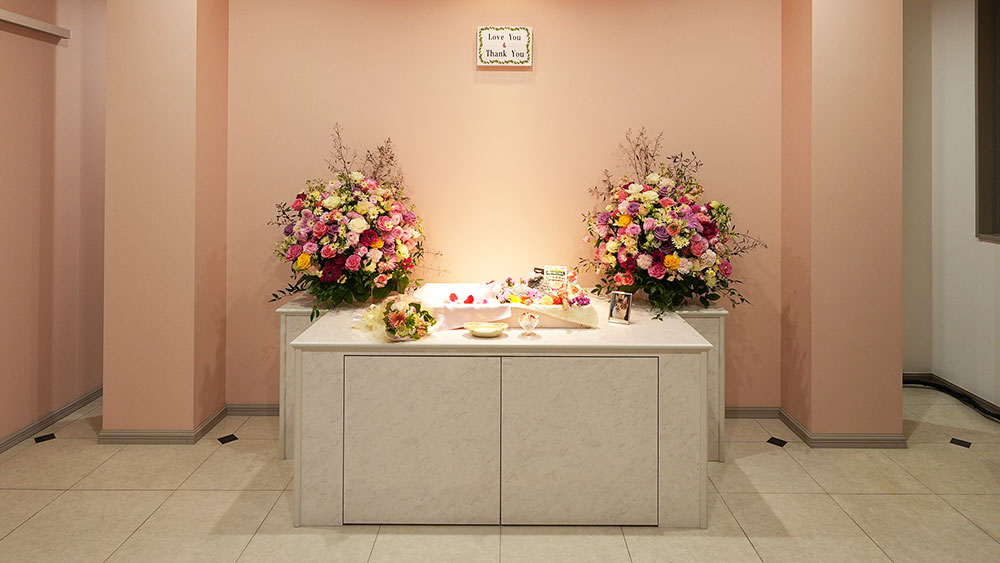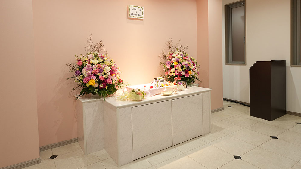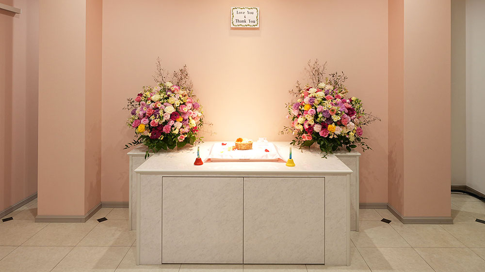 セレモニーホールに生花で飾った祭壇をご用意致しますので、10分程度の最後のお別れをして頂けます。