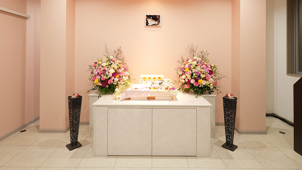 セレモニーホールに生花で飾った祭壇をご用意致しますので、10分程度の最後のお別れをして頂けます。