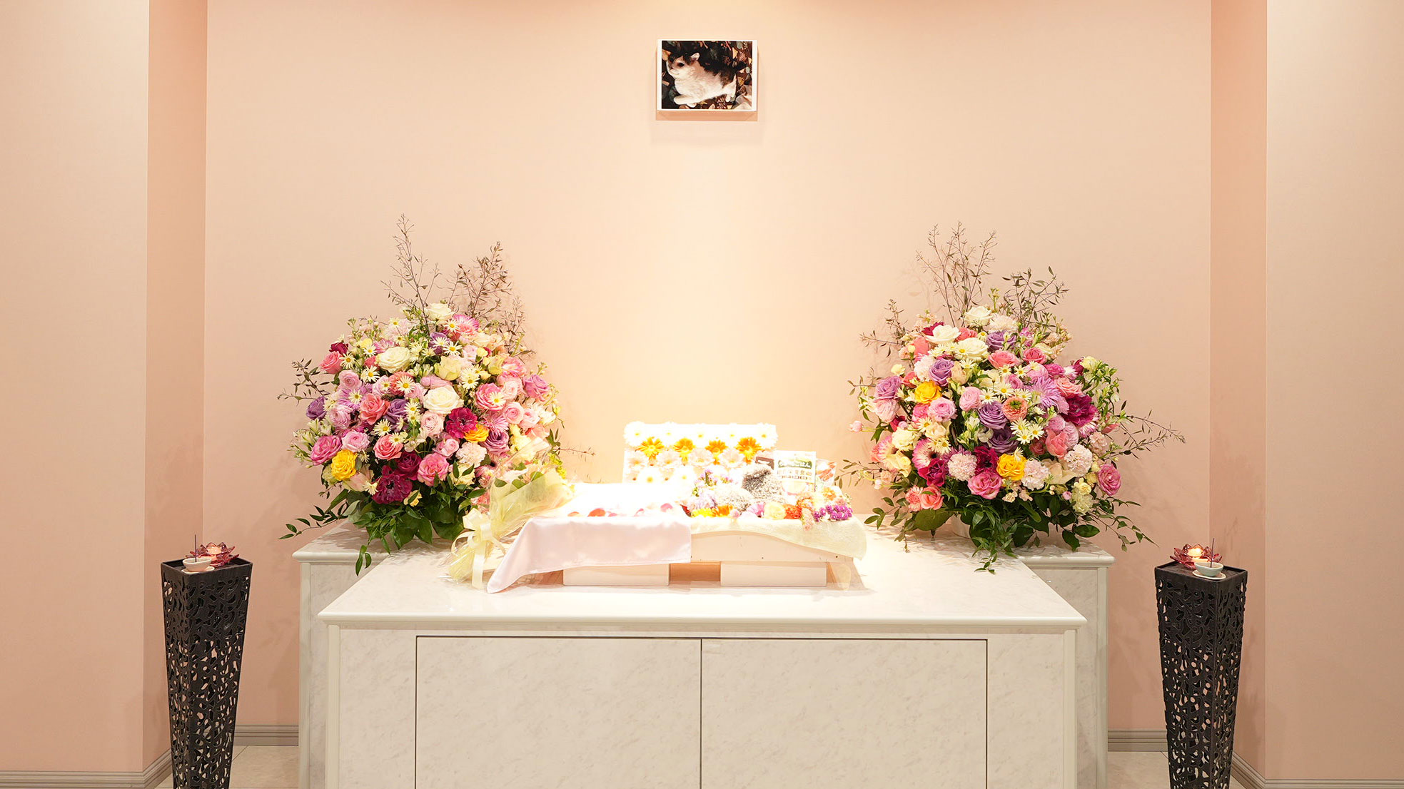 たくさんの生花で飾った祭壇のあるセレモニーホールにて、10分間のお別れ時間と、個別火葬、収骨を行なって頂けるプランです。